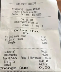 The incident happened at a Tulsa, Oklahoma Starbucks where the couple ordered their usual drinks, normally costing around $10 total.