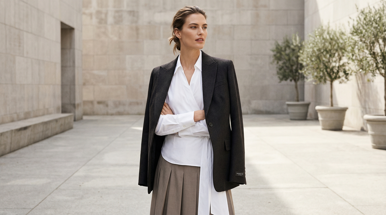 Key highlights include four new pant cuts showcasing sleek, elongated silhouettes with slightly cinched waists and sharp shoulders, reflecting the tailored shapes popular in the 1990s. The collection also offers a reimagined version of the iconic white button-up shirt, presented as a wrap-style top with an oversized, relaxed fit.