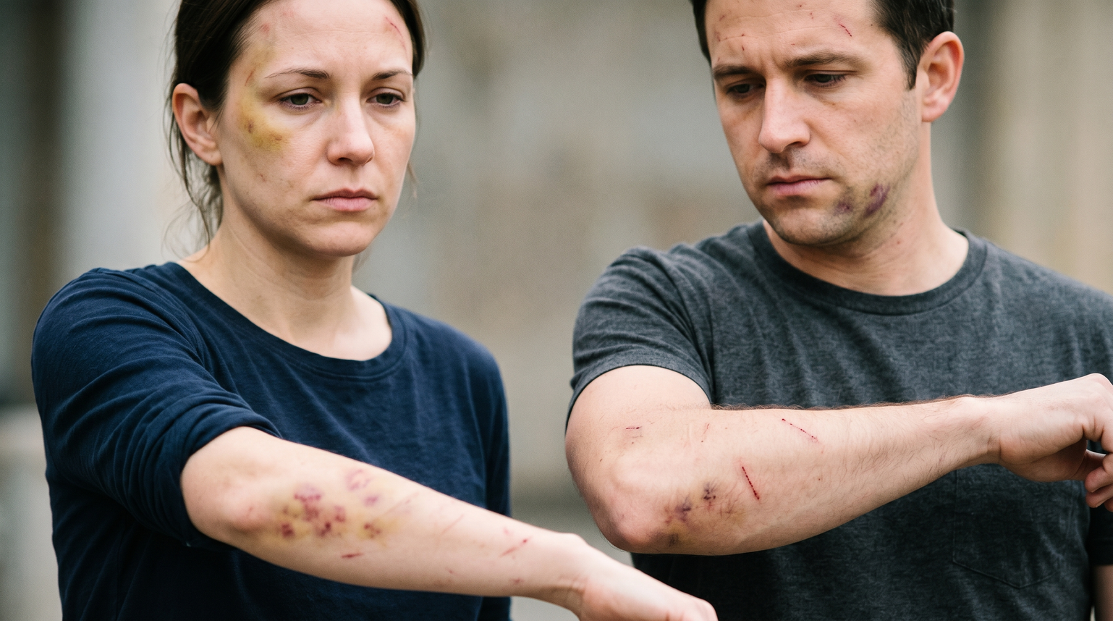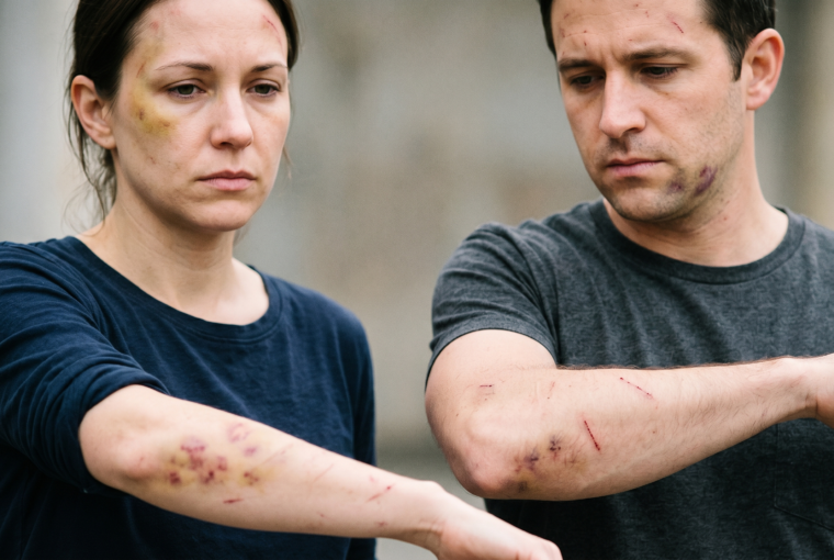 In one set of photos, Dakota Mortensen appears with bleeding from the nostrils and scratches on his neck, along with bruises near his knee and a mark on his eye socket. Other images show Taylor Frankie Paul with bruises on her forehead, neck, and arms. These injuries are allegedly connected to violent incidents between the couple, including an event in February 2026.