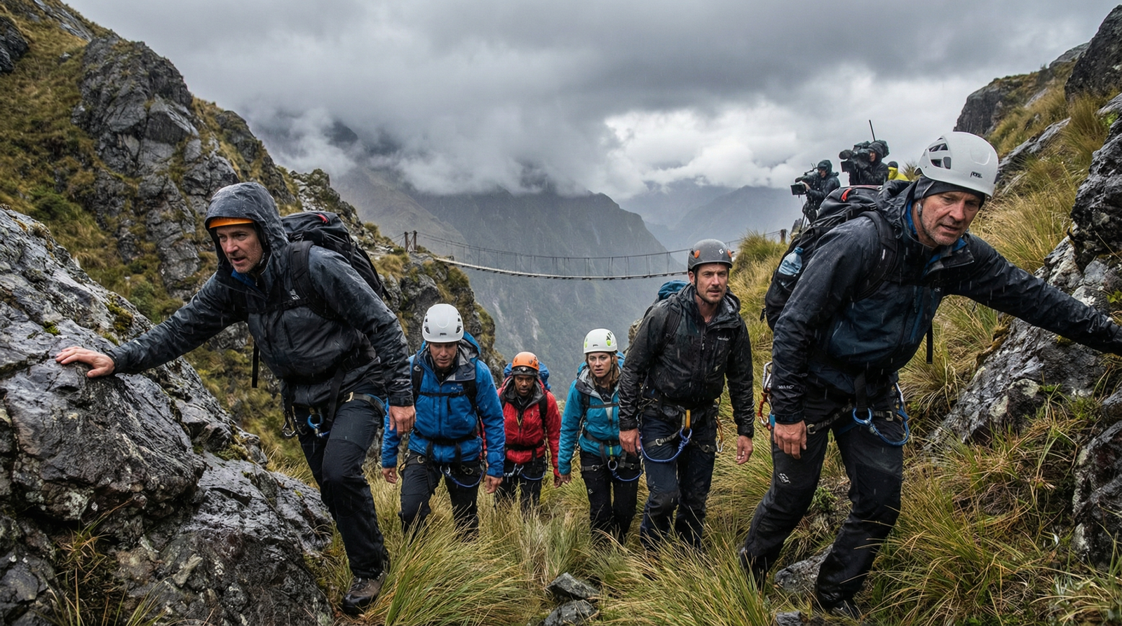 Miranda, a publican, volunteers to lead the team using her map-reading skills but struggles to maintain her leadership role as the group advances. Early challenges include crossing a rope bridge spanning an abyss, which Dockers attempts first. The team eventually reaches base camp, where they spend the night in tents on bare ground.