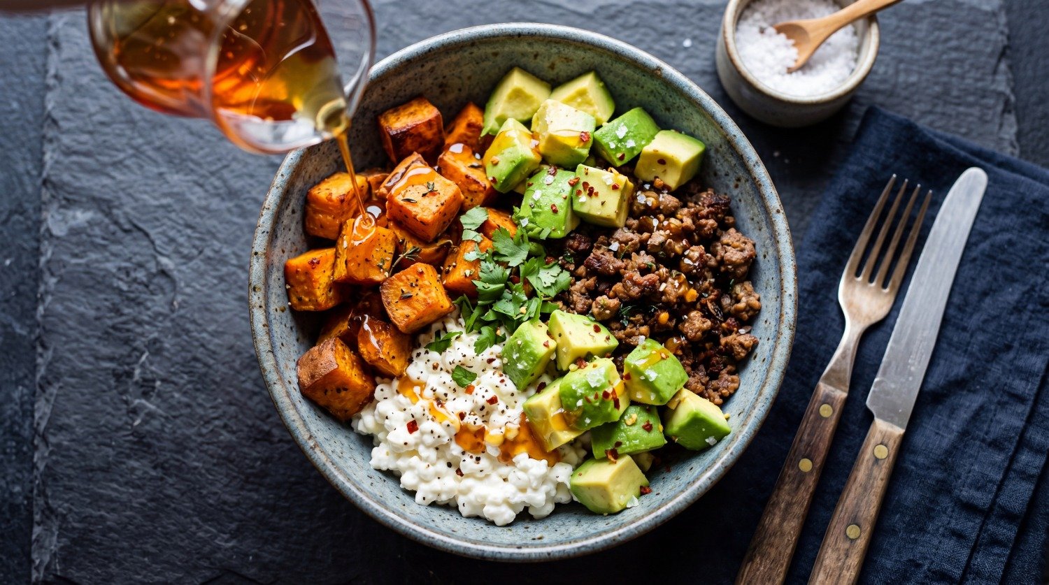 Bowl composition matters as much as cooking technique. Start with your protein base (cottage cheese) in the center — this anchors everything and prevents the bowl from looking like a pile of random ingredients. Arrange your sweet potatoes and beef in distinct sections rather than mixing them completely.